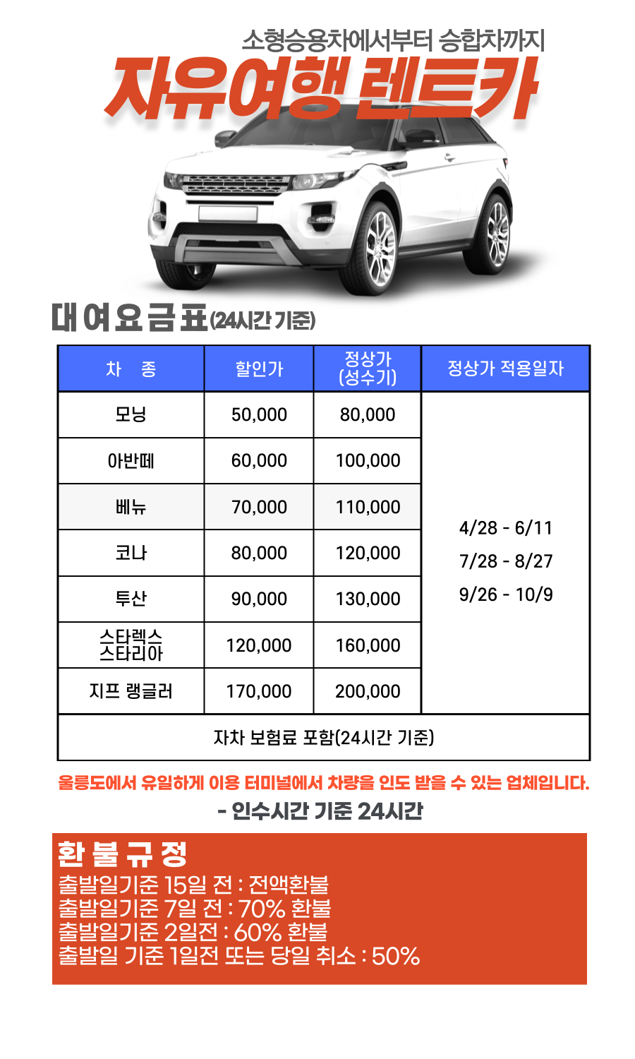 [렌트카] 울릉도 도착하는 항구에서 인수하는 렌트(자차보험 포함)