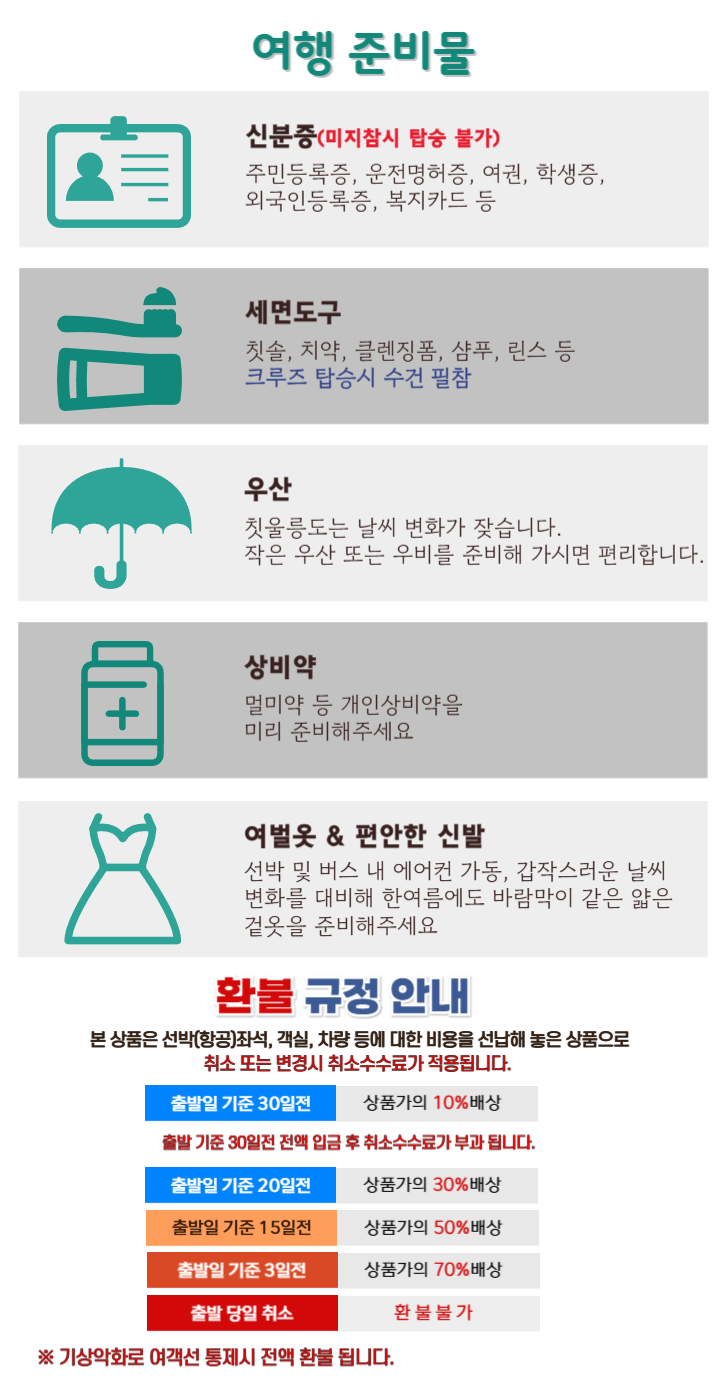 2014년 8월 7일부터 출발하는 모든 국내여행상품은 개인정보보호법(주민등록번호 처리의 제한) 등 관련 법률에 의거하여 개인정보(주민번호) 수집이 불가함에 따라 국내여행자보험 가입이 불포함으로 변경되었습니다. 단, 여행일정 중에 이용되는 교통수단(항공, 철도, 선박, 버스 등)은 각각 별도의 보험이 가입되어 있음을 알려드립니다. 여행자보험 가입을 원하실 경우에는 개별 가입을 권장드립니다. (여행자보험 : 투어세이프 Tel 1800-9010)